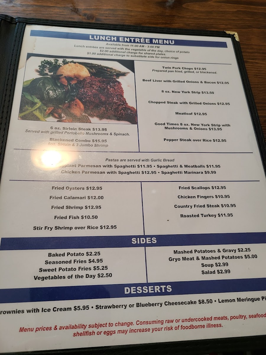 Start your meal with tempting appetizers like Fried Calamari and Beer Battered Fried Shrimp. Their fresh tossed salads include favorites like Julienne Salad and a delightful Greek option that will refresh your taste buds. For a hearty dinner, indulge in their entree menu, featuring Grilled Pork Chops and Fried Fish, all cooked to perfection.